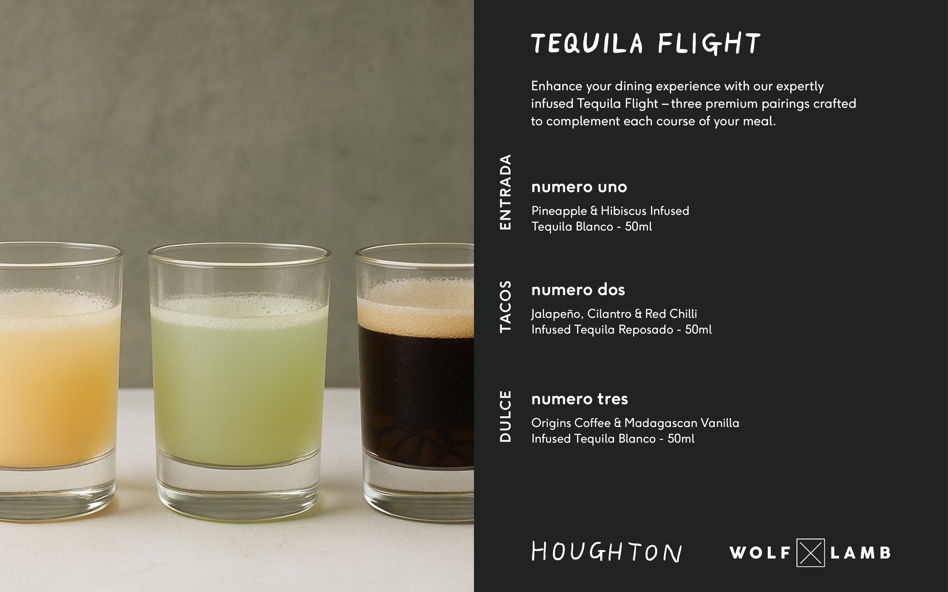 To elevate your evening, consider adding our Infused Tequila Flight available at a discounted early price for pre-booked guests. Please ensure you include enough for everyone attending.